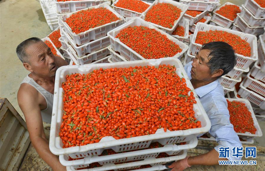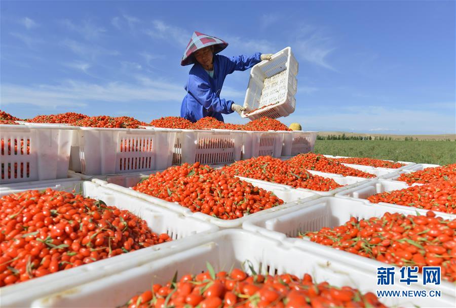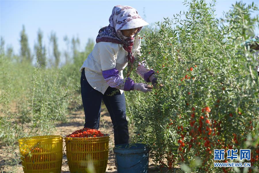 7月19日,在甘肅省張掖市高台縣黑泉鎮十壩村,農民在採摘成熟的枸杞。 在位於河西走廊的甘肅省張掖市高台縣,現在正是枸杞成熟的季節,農民們忙着採摘成熟的枸杞,進行晾曬加工。近年來,高台縣在戈壁荒灘等非耕地上發展特色林果產業,取得良好經濟和生態效益。目前,全縣引進5家企業在戈壁灘種植枸杞面積達2.2萬畝,產品遠銷國內外市場。 新華社發(鄭耀德 攝)