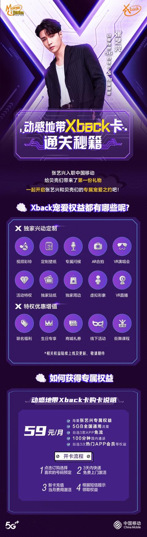 作為張藝興入職中國移動推出的第一款聯名產品,動感地帶Xback卡主打粉絲福利。資費套餐費為59元/月,除了基礎的流量、通話等權益外,還包括張藝興視頻彩鈴、月曆壁紙、AR+VR合照及正版周邊、粉絲見面會、演唱會、街舞課程等15項專屬定製福利。