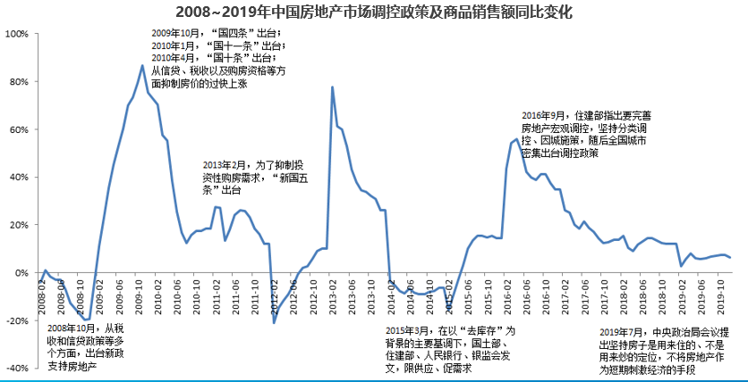 對於房地產行業,龔天璇認為宏觀調控政策對房地產行業影響較大,並對2008至2019年中國房地產市場調控政策及商品銷售額同比變化進行梳理,其指出在房地產市場商品銷售額出現轉折時基本都有相關政策的出台。此前,中央強調不將房地產作為短期刺激經濟的手段,據此,龔天璇認為短期內房價不會出現大規模下降和上升。