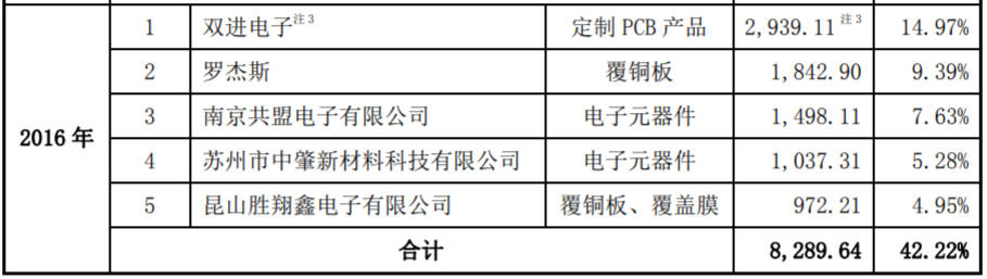 更何況,對比協和電子在新三板掛牌期間發佈的2016年年報,和本次招股書披露的2016年度採購數據,其中存在較大矛盾,其中針對第一大供應商雙進電子的採購金額相差上千萬元,招股書披露的第二大供應商羅傑斯則並未出現在2016年年報的前五大供應商中,針對其他供應商的採購金額,也多存在差異。