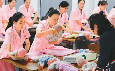 近年來,海南省儋州市打造“儋州月嫂”勞務品牌,解決大量農村中青年婦女的勞動就業問題。從2018年4月至今,該項目已幫助3000餘人實現就業。圖為7月21日,在儋州市的海南西部家庭服務中心,學員在老師指導下練習嬰兒包單。新華社記者 楊冠宇攝