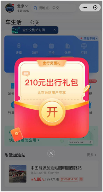 針對這一輪的“開城上線”,“騰訊出行服務”面向各城市用户均推出的優惠福利活動。自7月22日起,北京用户可獲得專享的“開城見面禮”,用户在“騰訊出行服務”小程序首頁可以領取價值210元的加油券、保養券、洗車券、打蠟券等出行福利。