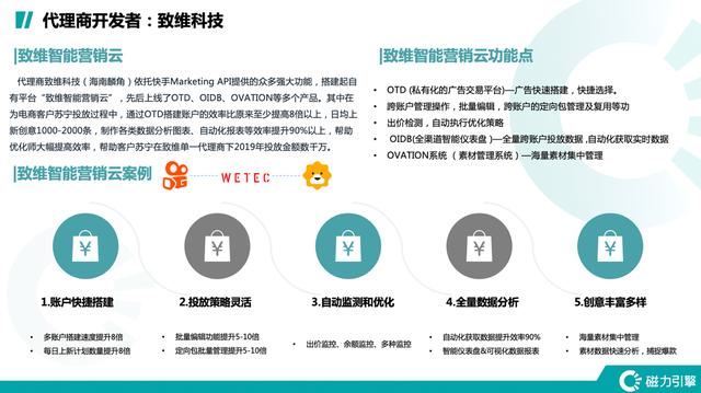 眾所周知,代理商對多樣性營銷需求迫切,需要可涵蓋多種功能的接口,以滿足其對接多客户的需求。代理商致維科技(海南麟角)依託快手Marketing API提供的眾多強大功能,搭建起自有平台"致維智能營銷雲",先後上線了OTD、OIDB、OVATION等多個產品。其中在為電商客户蘇寧投放過程中,通過OTD搭建賬户的效率比原來至少提高8倍以上,日均上新創意1000-2000條,製作各類數據分析圖表、自動化報表等效率提升90%以上,幫助優化師大幅提高效率,在電商客户成功的經驗也在其他數十個客户得到複製,全方位幫助提高投放成效。