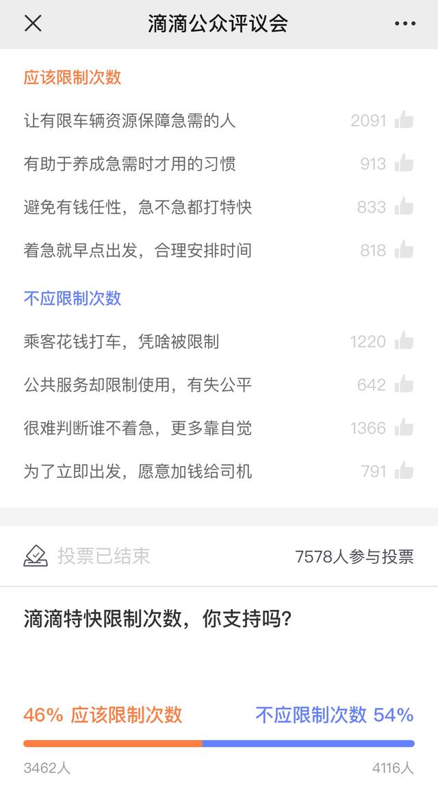 此前,滴滴推出公眾評議會第14期,針對"滴滴特快是否限制次數"向社會公眾徵集意見。投票結果顯示, 54%的用户不支持限制使用次數。因此,滴滴特快在試運營期間,暫不限制使用次數,未來將根據用户使用情況和反饋即時調整。
