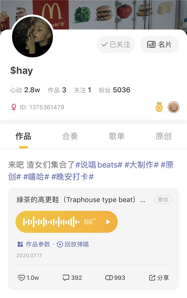 葉初然在唱鴨App發佈了3首歌曲就獲得了近三萬次點贊
