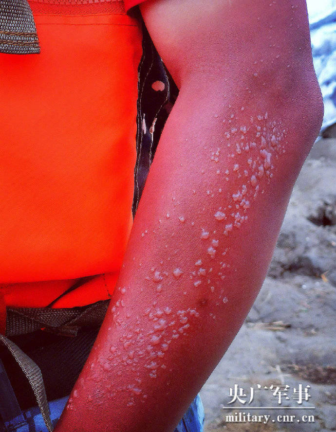 7月的洪湖,白天地表温度高達35℃,在太陽連續炙烤下,空降兵某旅的勇士們持續戰鬥,許多戰友的皮膚都被曬傷、灼傷,胳膊起了水泡(央廣軍事)。