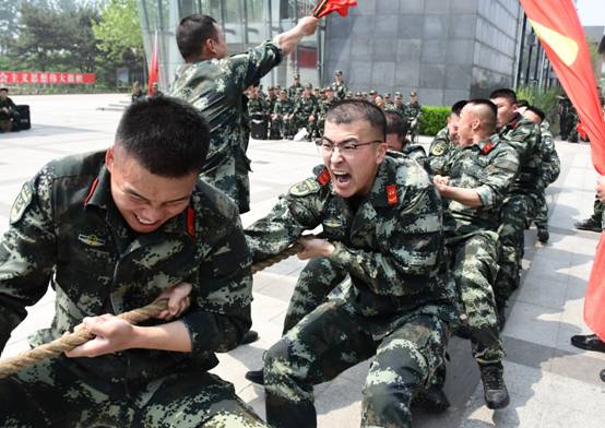鼓聲雷動,呼聲震天,你來我往,人頭攢動。拔河比賽現場,氛圍濃厚,場上參賽隊員齊心協力,奮力拼搏,場下觀眾吶喊助威,加油鼓勁。部隊的凝聚力也在陣陣加油吶喊聲中凝成一股繩、聚成一團火。