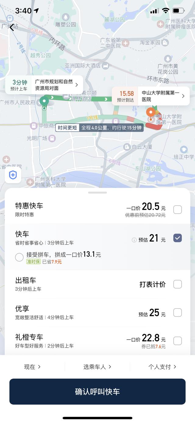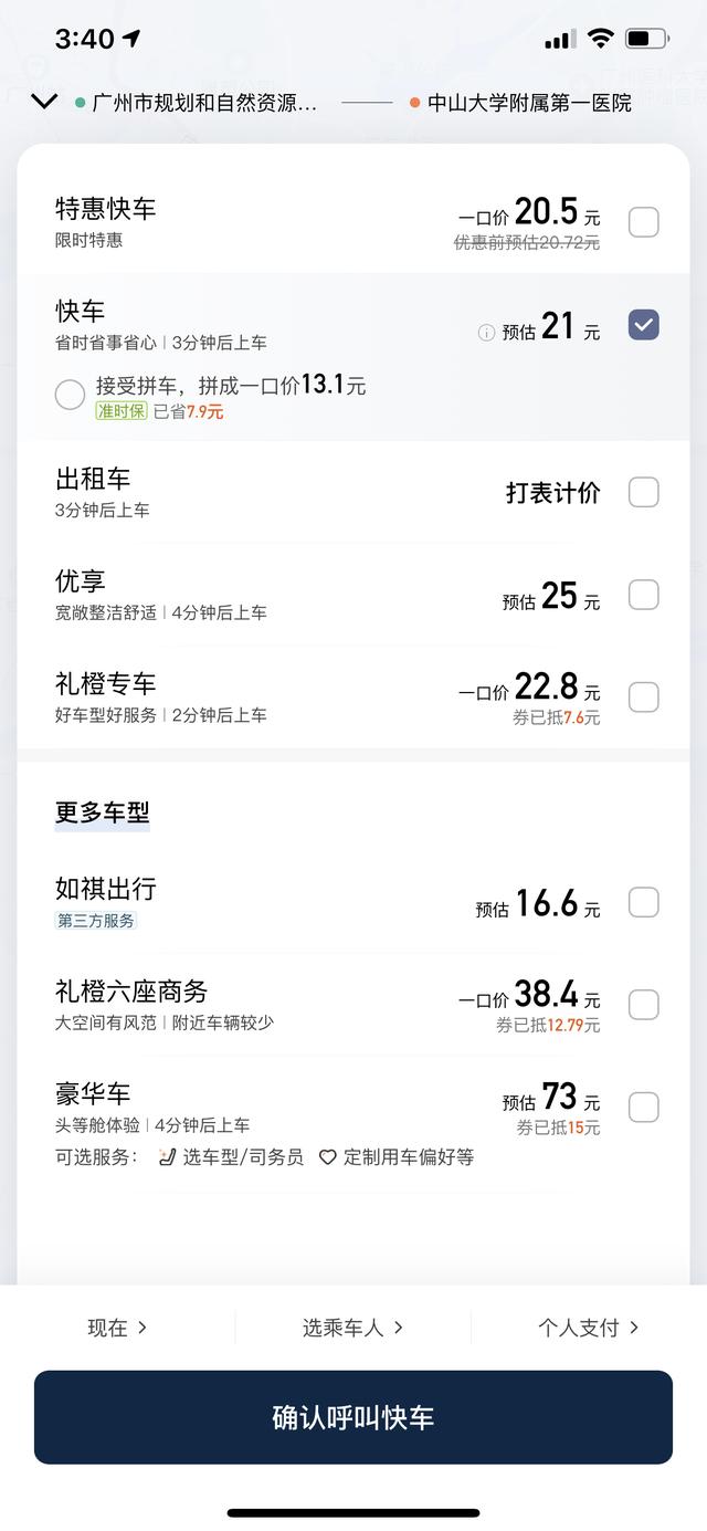 滴滴出行APP6.0版本中,各車型的服務特點、預估價格與預計上車時間、優惠金額等信息被明確標出,讓乘客能一目瞭然的看到當前不同車型的預估車費,方便比價,更快出發。