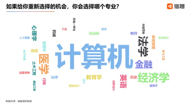 當被問到“如果給你重新選擇的機會,你會選擇哪個專業?”時,大部分職場人選擇的專業為計算機,金融、經濟學、法學、醫學、心理學等專業的得票率亦較高。這些專業普遍具有薪資高、專業性強的特點。