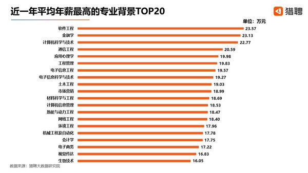 市場給出的薪資的高低亦是評估不同專業就業前景的直觀因素之一。獵聘大數據顯示,近一年平均年薪最高的專業背景TOP20中,軟件工程專業排名第一,為23.57萬元;金融學、計算機科學與技術、通信工程均超過20萬元,分別為23.13萬元、22.77萬元、20.59萬元。應用心理學、工程管理、電子信息工程、電子信息科學與技術、土木工程專業位居前九,平均年薪在19-20萬之間。