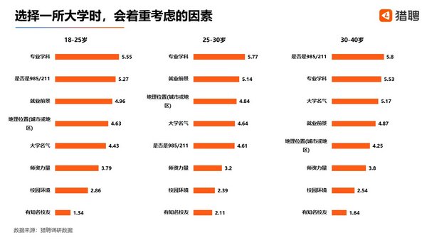 此外,獵聘還對已經畢業的職場人發起調研。當被問及“當你選擇一所大學時,會着重考慮哪些因素”時,95後排名前三的考慮因素是專業學科、學校是否是985/211、就業前景;90後最看重專業學科、就業前景和學校所在地理位置;80後則主要考慮學校是否是985/211、專業學科以及大學名氣。不同代際的職場人側重點差別較大,95後相對考慮的因素更為均衡,90後更在乎就業,80後則更關注大學的知名度。