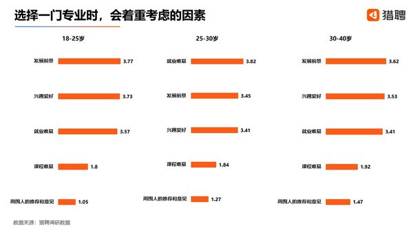 專業如何選擇也是考生在高考後需要面臨的一大難題,獵聘調研結果顯示,95後和80後在選擇專業時的更追求現實與愛好的平衡,兩者排名前二的考慮因素均為發展前景、興趣愛好。而90後在這三個羣體中表現的最為現實,其考慮的因素主要為就業難易、發展前景。
