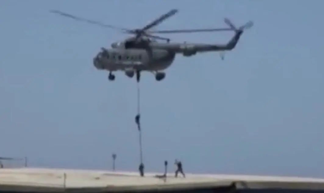 此次演習的亮點之一就是模擬攻擊航母,這艘航母模型仿照美國海軍“尼米茲”級航母建造,甲板上還停放着艦載機模型。伊朗公佈的畫面顯示,一架攻擊直升機發射了一枚導彈攻擊了“航母”,隨後突擊小隊索降登艦,同時大批武裝快艇將“航母”圍住。