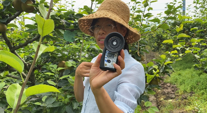 在樹下,她拿着無損測糖儀挨個給梨做體檢,“以前測甜度需要切片,現在就跟人們測體温一樣,一照就顯示了。”一週前是11度,曹宇鋒決定推遲採摘時間。“好梨不怕等。”直到四天前,樹上的梨普遍達到或超過12度,她給採摘負責人打電話,“可以了。”
