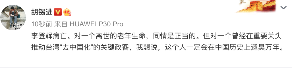 環球時報總編輯胡錫進對李登輝病亡發表評論,全文如下:
