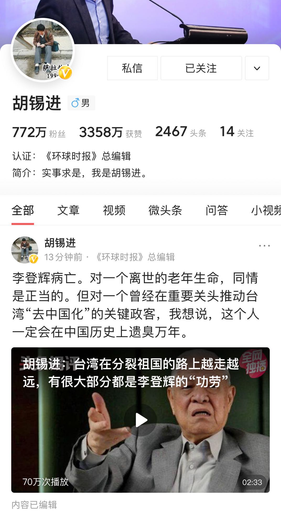 剛剛,環球時報總編輯胡錫進對李登輝病亡發表評論,全文如下: