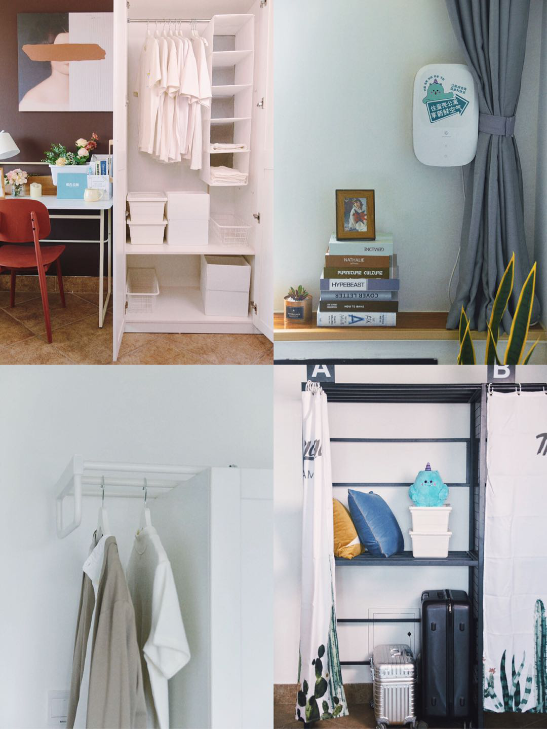 值得一提的是,在公共區域的客廳中增設的儲物架,分為上下兩層,分別對應不同的儲物場景,不僅合理的劃分了公共區域空間,更同時滿足了合租時每個房間對於公共區域獨立儲物的需求。