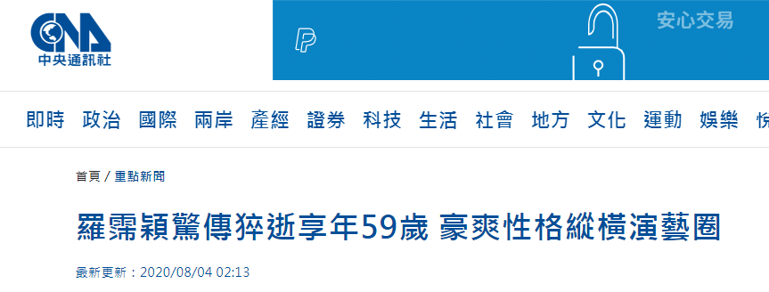 【環球網報道 記者 張麗媛】台灣“中央社”8月4日報道稱,台灣資深藝人羅霈穎驚傳猝死,終年59歲,因其友人多日聯繫不上她,不放心到羅霈穎位於台北市八德路三段的住所查看,才發現她已身亡數天。“中央社”稱,記者致電羅霈穎經紀人,至截髮稿前未得到回應。