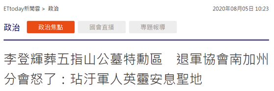 李登輝7月30日病亡,台媒此前報道,台當局計劃將其遺體葬在台灣五指山軍人公墓“特勳區”。台灣ETtoday 、“聯合新聞網”等台媒報道稱,對此,台灣退伍軍人協會“南加州分會”發佈聲明批評,李登輝原名巖裏政男,曾為日軍侵華作戰;任台灣地區領導人期間開啓黑金政治,成“黑金教父”;李登輝成立“國家統一委員會”,曾主張兩岸統一,最後卻又變成“台獨”領袖,還曾宣稱釣魚台是日本領土,併到靖國神社參拜日本侵華戰爭的日本軍人亡靈。“終其一生,李是一位徹頭徹尾心繫日本,而極具爭議的政治人物。”