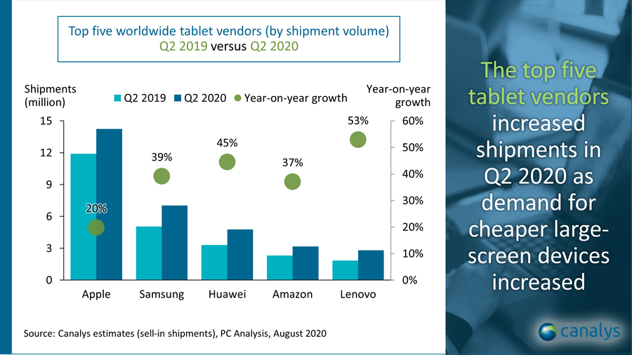 Canalys 分析師伊尚·杜特(Ishan Dutt)表示,新冠疫情期間人們居家辦公和學習成為常態,從而增加了對相關電子產品的需求。而與台式機和筆記本電腦相比,平板電腦的價格又更加親民,這也進一步促進了本季度平板電腦出貨量的增長。
