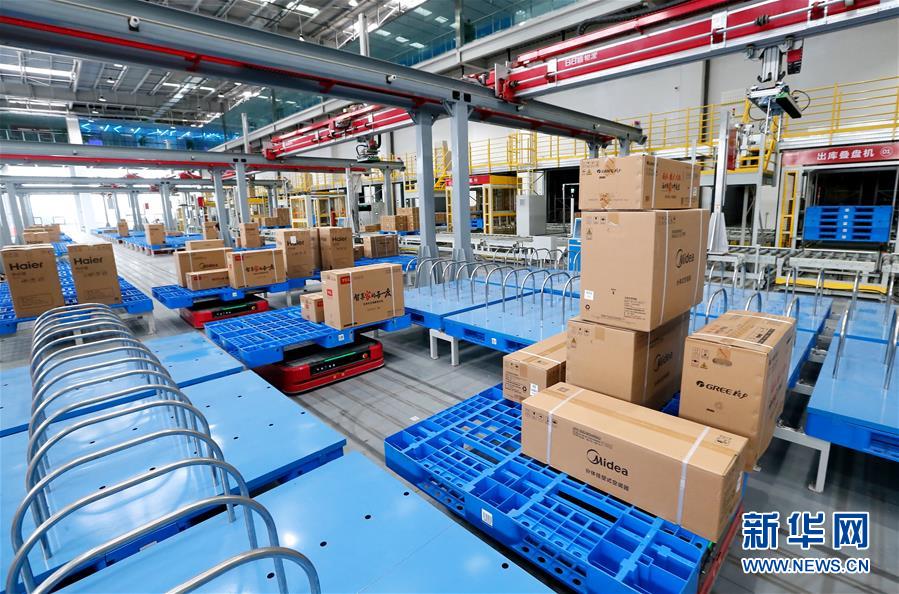 8月5日,在日日順物流(即墨)產業園的大件物流智能無人倉,碼垛機器人在搬運商品。 在位於山東省青島市即墨通濟新經濟區,由日日順物流打造的首個大件物流智能無人倉今年夏季投入運行。該無人倉應用全景智能掃描站、關節機器人、吸盤龍門揀選機器人等多項定製智能設備,採用5G和視覺識別、智能控制算法等人工智能技術,可實現冰箱、空調等大件商品24小時不間斷分揀作業。 新華社發(梁孝鵬 攝)