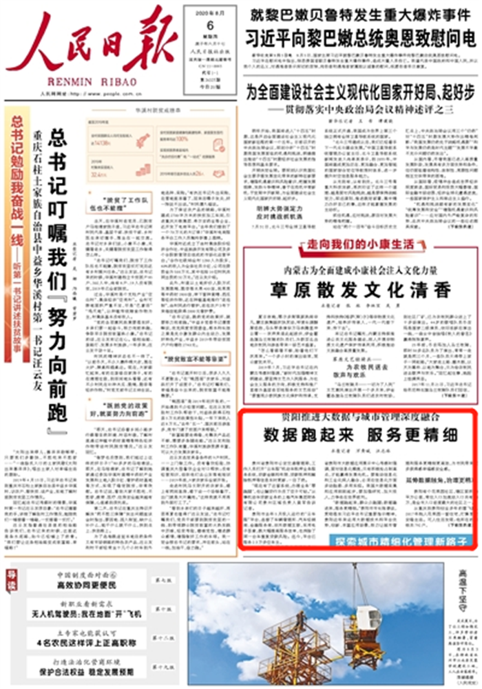 8月6日出版的《人民日報》,在頭版“探索城市精細化管理新路子”專欄刊發了題為《貴陽推進大數據與城市管理深度融合 數據跑起來 服務更精細》的文章,點贊貴陽近年來運用大數據技術和平台優勢,創新、豐富應用場景,努力讓城市管理和服務更精細更高效,為市民帶來更多獲得感幸福感安全感。