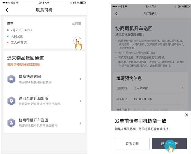 遺失物品送回功能有三種送回方式,分別是協商快遞送回、送回至附近派出所和協商司機開車送回。如果乘客遺落物品在車上,在訂單結束後的48小時內,可根據自身需求,三種任選。