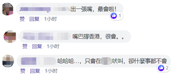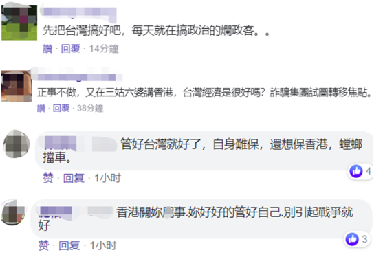對於蔡英文的上述相關言論,有島內網友留言批評蔡英文“就會嘴巴撐香港”。↓