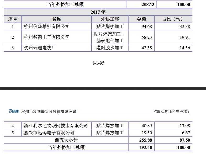 與此同時,山科智能前後發佈的招股書材料對於外協加工商的數據披露也存在矛盾。此次招股書顯示,2017年山科智能第三大外協加工商是杭州雲通電線廠,合作金額42.58萬元,佔比14.56%;但2018版招股書前五大外協商卻沒有杭州雲通電線廠。