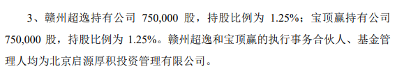 根據招股書披露,日月明的前十大股東中包括有“贛州超逸投資中心(有限合夥)”和“寧波梅山保税港區寶頂贏股權投資合夥企業(有限合夥)”兩隻股權投資基金,持股數量均為75萬股、合計持有日月明2.5%股權,兩隻基金的管理人均為“北京啓源厚積投資管理有限公司”。