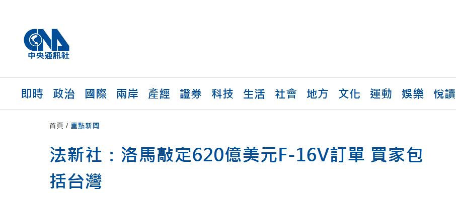 【環球網報道 記者 尹豔輝】據台灣“中央社”等台媒報道,有消息人士向法新社證實,美國武器製造商洛克希德馬丁(Lockheed Martin)獲得10年總價共620億美元的F-16V訂單,其中要提供給台灣的部分已經定案。對於這則消息,有網友酸諷,都是榨汁機操作,美國與民進黨聯手,榨到台灣乾塘(意為身無分文)就鬆手。