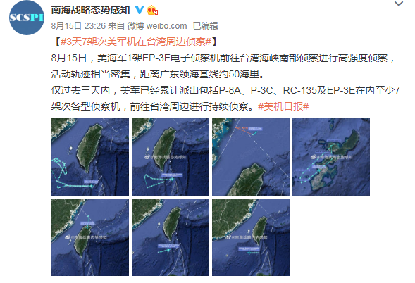 據“南海戰略態勢感知計劃”平台8月15日發佈的消息,8月15日,一架隸屬於美國海軍的EP-3E電子偵察機現身南海,在台灣海峽南部開展偵察飛行活動,最近時距離廣東領海基線51.19海里(約合92.95公里)。