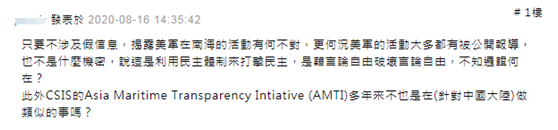 對於這一説法,有島內網民直接反問:只要不涉及假信息,揭露美軍在南海的活動有何不對,更何況美軍的活動大多都有被公開報道,也不是什麼機密,説這是利用民主體制來打擊民主,是借言論自由破壞言論自由,不知邏輯何在? 該網民還提到,此外CSIS(美國國際戰略研究中心)的Asia Maritime Transparency Intiative (AMTI)(亞洲海事透明度倡議計劃)多年來不也是在(針對中國大陸)做類似的事嗎?↓