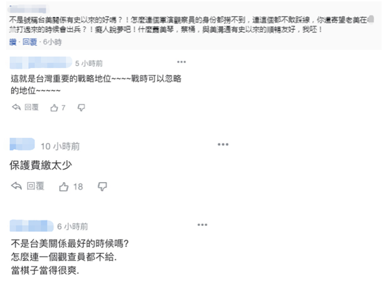 消息傳出後一度在島內引發熱議。民進黨當局連連感謝,還聲稱這顯示美方對台海和平穩定的高度重視。有島內網民則基於歷年來台軍“漢光演習”事故頻發嘲諷稱:“參加軍演是要演登陸艇翻船?直升機墜落?飛彈誤射?坦克掉溝?哪一齣?”當時也有網民直言,“你是筆尖,只是一個棄子,還參加演習?”