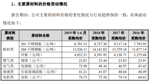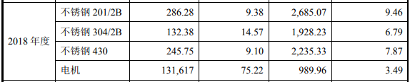再來看採購端的信息,億田股份的主營產品為集成灶,原材料涉及到板材和電機等,與擬上市公司帥豐電器為可比上市公司。根據招股書披露,億田股份的201型不鏽鋼採購單價在2018年為9.38元/千克,而同年帥豐電器採購的201型不鏽鋼價格則僅為8727.3元/噸,折算為8.73元/千克,相比億田股份低了6%以上。