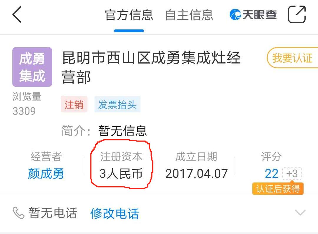 而根據公開信息顯示,昆明市西山區成勇集成灶經營部也是註冊成立在2017年4月,註冊資本為3元、無實繳資本,後於2018年3月註銷。