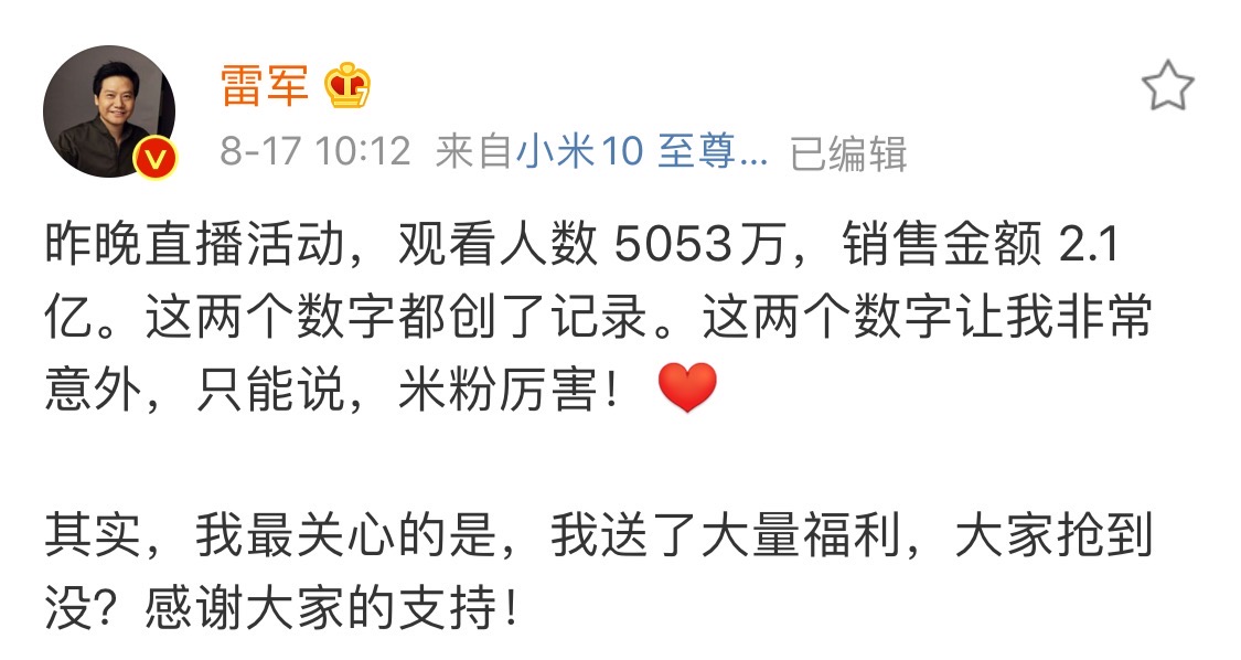 “2.1億“的成績單、5053萬的累觀看人數,不僅創造抖音直播帶貨兩個新記錄,也可以説是米粉對於小米過去十年的肯定,其中也包含對小米下一個十年的期待。每一次上架的產品“秒沒”之後,雷軍都對米粉的熱情表示感謝。首秀成績出爐後,他在微博表示:“這兩個數字讓我非常意外,只能説,米粉厲害!”