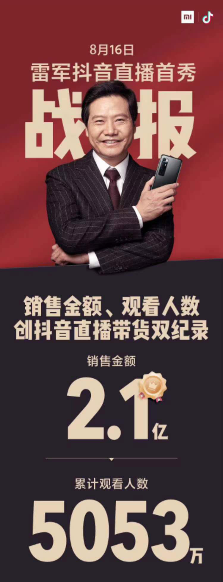 【環球網科技綜合報道】8月16日晚間,小米創辦人、董事長兼CEO雷軍親自上陣,開啓抖音直播首秀。17日,小米官方公佈數據:雷軍直播帶貨首秀銷售金額為2.1億元,累計觀看人數達5053萬,創抖音直播帶貨雙紀錄。