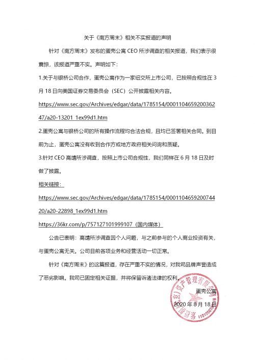 關於高靖被調查一事,蛋殼公寓於6月18日發佈公告表示,“高靖所涉調查因個人問題,與之前參與的個人商業投資有關,與蛋殼公寓無關。公司目前各項業務和經營活動一切正常。”