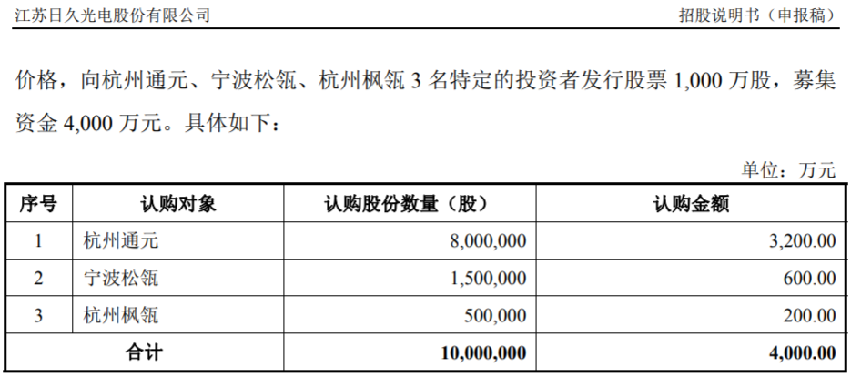 首先值得關注的還是日久光電引入外部投資機構的事項。杭州通元優科創業投資合夥企業(有限合夥)是日久光電的第6大股東,持股比例為4.44%,招股書披露,2017年11月日久光電以4元/股的價格向杭州通元、寧波松瓴、寧波楓瓴定向增發共計1000萬股股份;此後在2018年6月,日久光電再次引入弘灣資本、寧波通元、毅瑞投資等機構入股時,每股增資價格就已經是5元/股了。也即,杭州通元、寧波松瓴、寧波楓瓴入股後僅半年時間,就增值了25%。