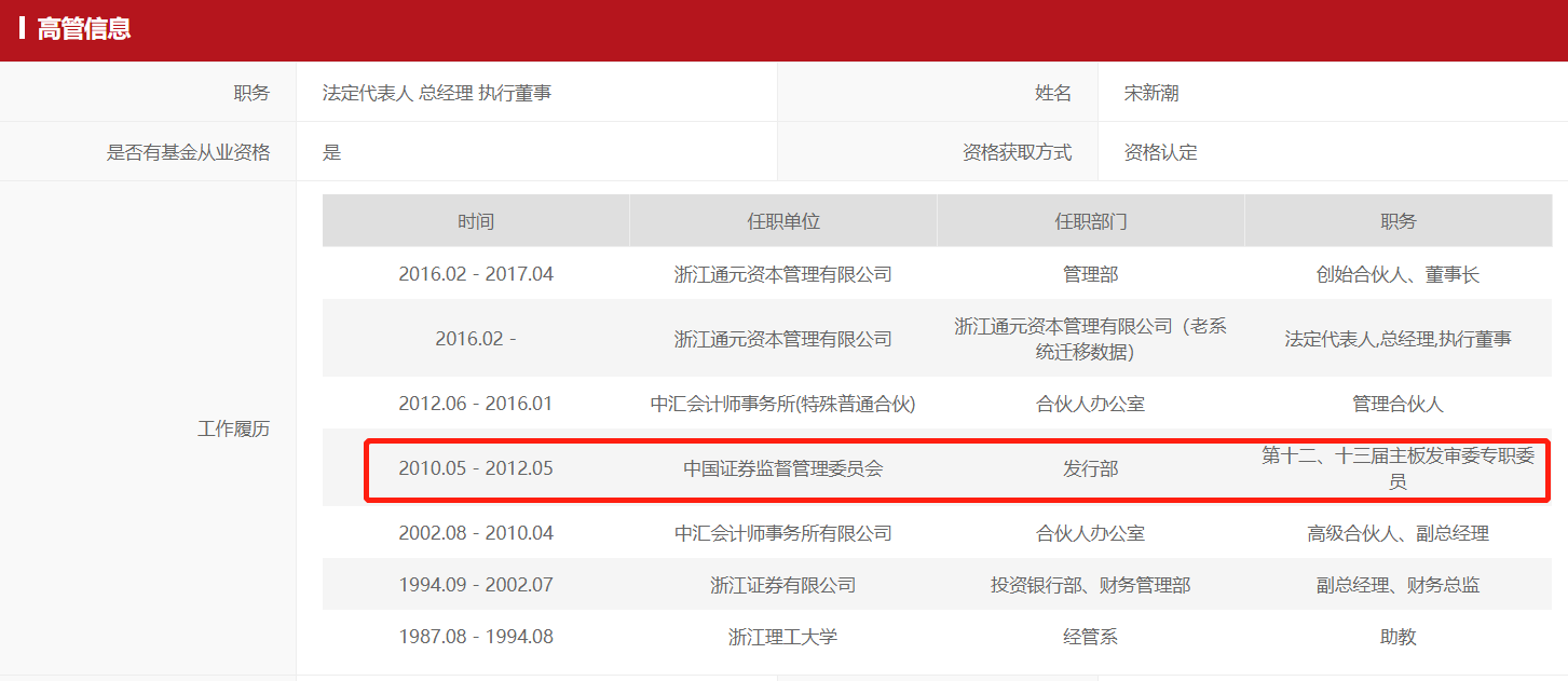 杭州通元的基金管理人為浙江通元資本管理有限公司,同時寧波松瓴、寧波楓瓴的執行事務合夥人則為浙江通元的控股股東,根據證券投資基金業協會公示的信息,浙江通元資本管理有限公司的執行事務合夥人為宋新潮,此前長期擔任中匯會計師事務所合夥人,以及中國證監會第十二屆、十三屆主板發行審核委員會委員。