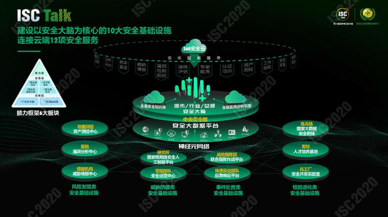 在安全基礎設施落成之後,360將通過持續化的運營,從中獲取並積累包括安全開發、實戰檢驗、網絡測繪、威脅識別、安全防護、檢測分析、指揮響應、應急恢復、學習與進化還有知識構建這10大安全能力。