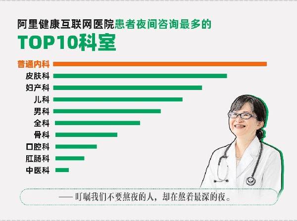 互聯網,夜不眠。零點過後的阿里健康互聯網醫院上,仍有超600名醫生在線守護。《報告》顯示,晚間患者諮詢最多的TOP10科室,分別為:普通內科、皮膚科、婦產科、兒科、男科、全科、骨科、口腔科、肛腸科、中醫科。