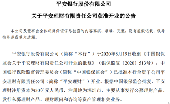 8月18日,江蘇銀行、南京銀行同時發佈公告稱,收到銀保監會的批覆,同意全資理財子公司蘇銀理財有限責任公司、南銀理財有限責任公司開業。8月19日,平安銀行也發佈公告,稱銀保監會已批准全資子公司平安理財有限責任公司開業。