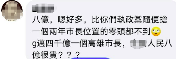 還有島內網友質疑,陳國邁花4000億新台幣搶當高雄市長,為台灣人民花8億就很貴?↓