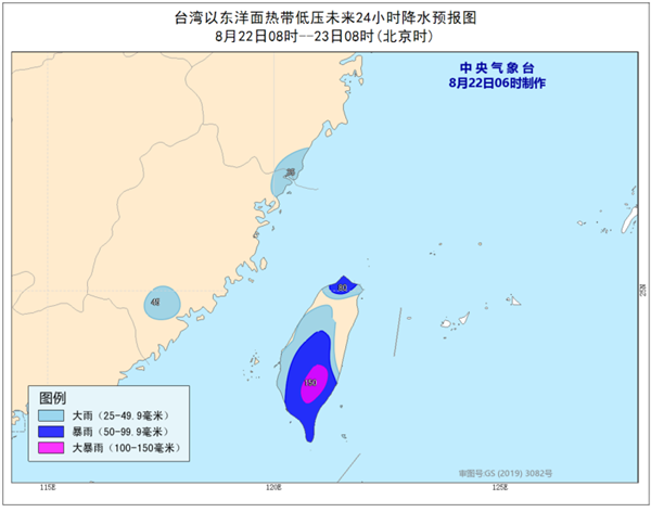 降水預報:22日08時至23日08時,台灣島大部、浙江東南部沿海和福建東南部的部分地區有大雨或暴雨,其中,台灣島南部局地有大暴雨(100-150毫米)。