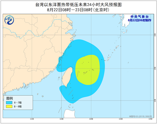 台灣島以東洋麪熱帶低壓於昨天晚上8點鐘生成,今天(22日)早晨5點鐘其中心位於日本沖繩那霸西南方約630公里的洋麪上,就是北緯22.4度、東經123.1度,中心附近最大風力有7級(15米/秒),中心最低氣壓為1002百帕。
