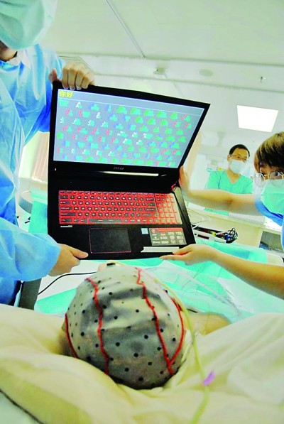 8月6日上午,在徐光華及其團隊的努力下,患者被戴上了腦電帽,用BCI技術,在經過引導教學後,患者看着電腦屏幕上不斷跳動的字符,不一會兒就在屏幕上跳出了“你好”兩個字。“腦電帽採集到患者的腦電信號後,通過計算機處理和分析,就可以精準捕獲患者的想法。”王小闖説。