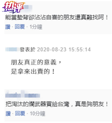 但是這一説法立即引發了台灣網友的羣嘲,台灣民眾的真實感受與這位幕僚的説法完全就不是一個畫風:“能當墊背卻沾沾自喜的朋友還真難找啊”“朋友真正的意義,是拿來出賣的”“把淘汰的爛武器賣給台灣,真是夠朋友”“美國人的字典裏沒有‘真朋友’這個字”。