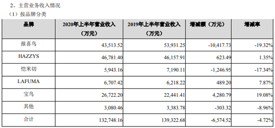 另外,按公司產品品牌收入來看,報喜鳥品牌產品營收佔比最大,但收入下滑也最明顯,只有HAZZYS和寶鳥實現了正增長。